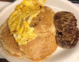 3 pancakes, 2 eggs any style and choice of meat.bacon, sausage, ham or scrapple.